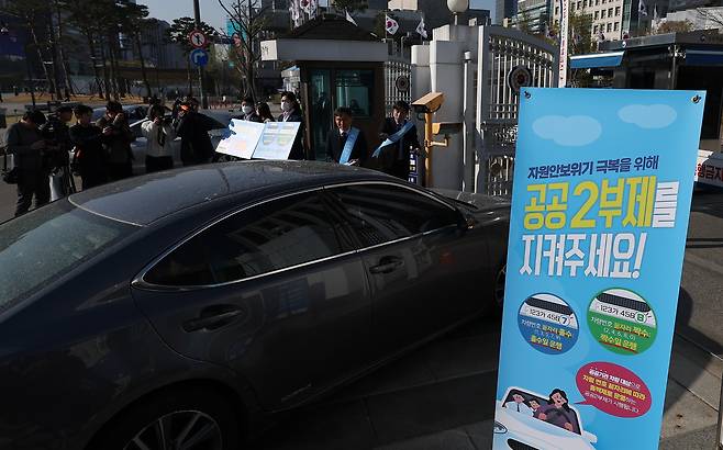 | ▲ 중동 위기가 계속되며 유가가 오르자 정부가 공공기관 승용차 5부제를 지난 8일부터 2부제(홀짝제)로 강화했다. 이날 서울 종로구 정부서울청사에서 직원들이 홍보 캠페인을 진행하고 있다. |