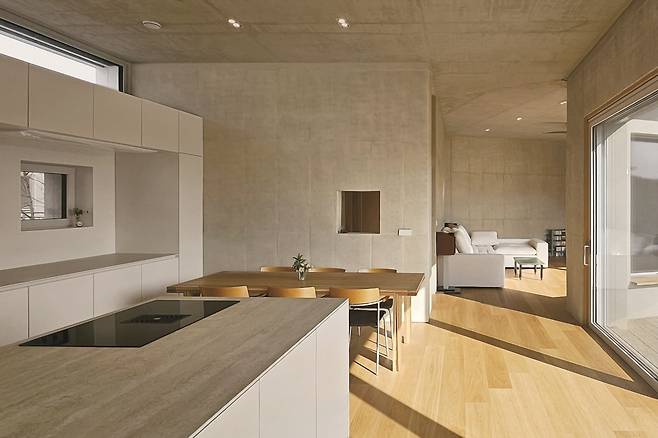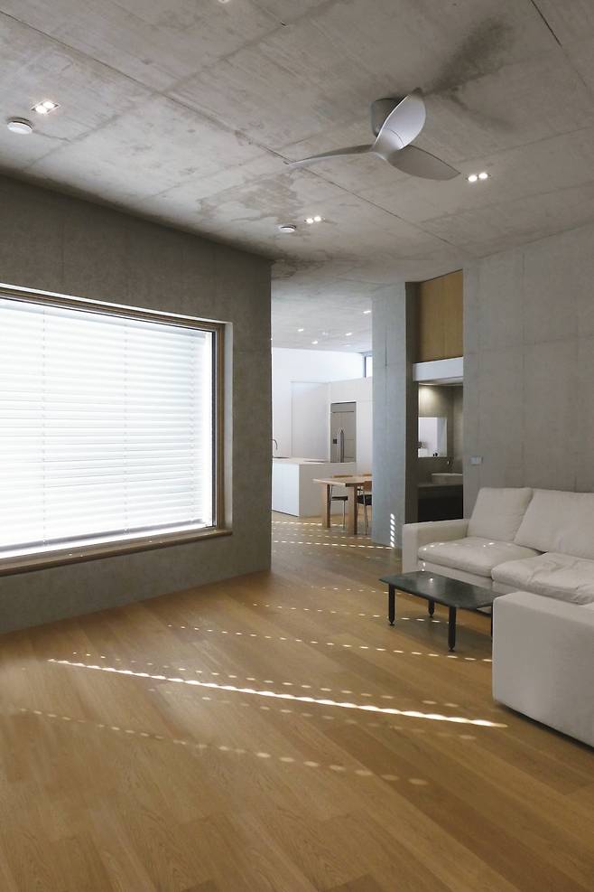 내부에 단차가 없는 단층주택이기 때문에 실내 공간이 자칫 단조로워질 수 있었다. 이는 높은 층고와 고창을 활용해 다양한 공간감을 연출해 해소했다. 그러면서도 주택 가장 안쪽의 안방은 층고를 다소 낮춰 개방감보다는 아늑한 공간으로 계획했다. 실내 주요 벽면과 천장은 노출콘크리트를 적용했다. 그래서 천장과 벽면의 모든 설비계획을 콘크리트 타설 전에 치밀하게 계획하여 변경 없이 정밀하게 시공해야 했다.