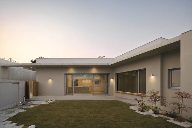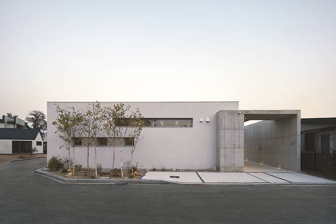 주택이 들어선 대지는 반듯한 택지로 구성된 전원마을의 중심에 자리했다. 건축주가 분양받은 대지는 그중에서도 북측으로 폭 6m 도로가 꺾여 돌아가는 코너 땅이었다. 건축주는 은퇴한 60대 부부로 노후를 건강하고 쾌적하게 보내기 위한 용도의 주택을 원했다. 대지 매입 후 건축주는 2년여간 앞으로 지어질 집을 그리며 준비했다. 그 고민의 끝에서 오래 지켜봐도 싫증 나지 않을 스타일로 40평 규모의 단층집을 짓기로 했다.