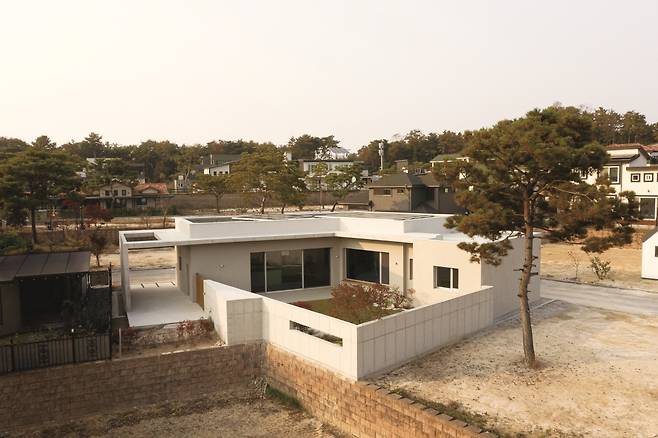 대지의 형태를 이용하여 외부공간을 구획하고 동선에 따른 실내공간을 배치했다. 대지가 코너 땅에 위치하기에 마을 경관을 배려해 건물을 도로에서 이격해 조경을 식재했다. 진입 동선이자 바람길로 계획한 커다란 오프닝을 지나 대지 내로 들어오면 나란히 자리한 대문과 현관문을 마주하게 된다. 대문은 주요 동선으로 사용되며 현관은 기능적인 역할을 한다.계획 대지의 특성상 인접 대지와의 프라이버시 문제를 해결해야 했다. 대지가 마을의 중앙에 있어 야간에 실내가 쉽게 노출될 것을 예상했다. 따라서 마당을 감싸는 담장을 외부창고와 함께 계획했다. 실내에서는 답답하지 않고, 외부에서는 내부가 보이지 않을 적정 높이를 세밀히 조율했다. 건축주는 주택의 난방이나 온수설비 등에 들어갈 모든 에너지를 전기로 대체하길 원했다. 과도한 전기사용량을 상쇄시킬 방안으로는 지붕 위 9㎾ 용량의 태양광 패널을 계획했다. 동시에 건축주는 패시브 주택에 준하는 성능의 건물을 요청했다. 패시브 전문 시공사와 컨설턴트를 통해 현재 독일파시브하우스협회(Passivhaus Institut)의 저에너지하우스 인증절차를 밟고 있다.