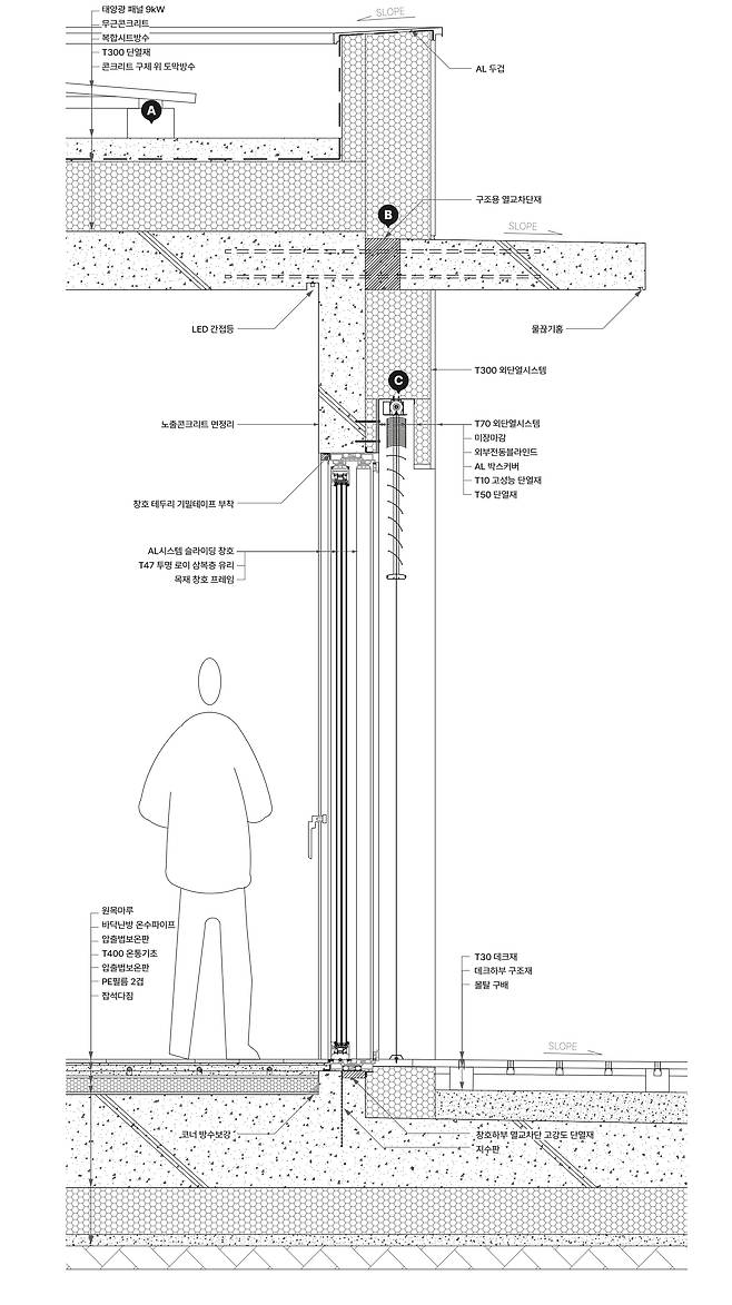 외부마감재 : 외벽 - 외단열시스템, 노출콘크리트 위 발수코팅 / 지붕 - 평지붕 외단열