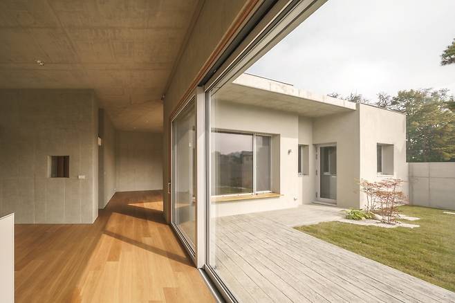 내부에 단차가 없는 단층주택이기 때문에 실내 공간이 자칫 단조로워질 수 있었다. 이는 높은 층고와 고창을 활용해 다양한 공간감을 연출해 해소했다. 그러면서도 주택 가장 안쪽의 안방은 층고를 다소 낮춰 개방감보다는 아늑한 공간으로 계획했다. 실내 주요 벽면과 천장은 노출콘크리트를 적용했다. 그래서 천장과 벽면의 모든 설비계획을 콘크리트 타설 전에 치밀하게 계획하여 변경 없이 정밀하게 시공해야 했다.