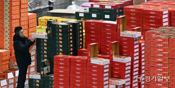 설 연휴를 앞둔 20일 새벽 인천 남동구 남촌농산물도매시장에서 열린 과일경매장에 참가한 중도매인들이 높이 쌓인 과일 상자 사이로 분주히 움직이며 과일을 살펴보고 있다.