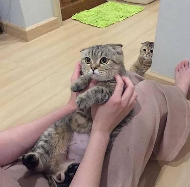 공개된 사진 속에는 집사가 막내 고양이를 번쩍 들어 안아서 자신의 무릎에 놓고 예뻐하는 모습이 담겨 있었죠.