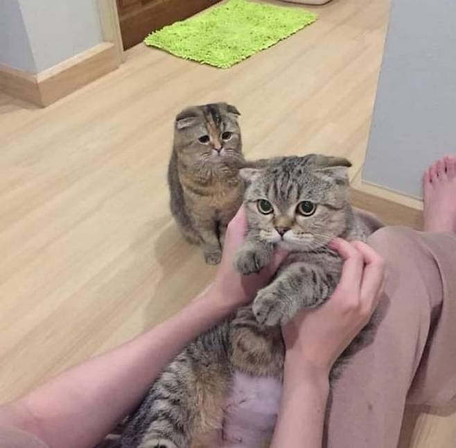 고양이도 알고보면 질투가 많다는 사실 알고 계신가요. 자기도 있는데도 불구하고 막내 고양이를 예뻐하는 집사의 모습에 서러움이 터진 고양이가 있습니다.