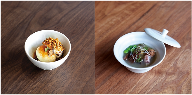 철마다 달라지는 메뉴를 그때그때 제일 좋아하지만 ‘장 트리오’는 특히 애정이 갑니다. 오픈 때부터 쭉 함께해온 고마운 메뉴입니다. 서양식 테크닉과 한국 장을 활용한 메뉴를 고민해보니 디저트나 유제품도 장과 충분히 어울릴 것 같아 개발했습니다. 그리고 최근에는 보양식을 모티브로 한 ‘밍글링 팟’을 좋아합니다. 밍글의 뜻처럼 국물 문화, 쌈 문화, 고기, 채소 등을 팟 안에 잘 어우러지게 만든 국물 요리입니다.