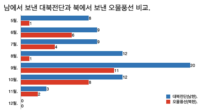 - 11월16일에는 또 탈북민 단체들이 대북전단을 날려보냈고 이틀뒤 북한에서 오물풍선이 또 날아왔다.