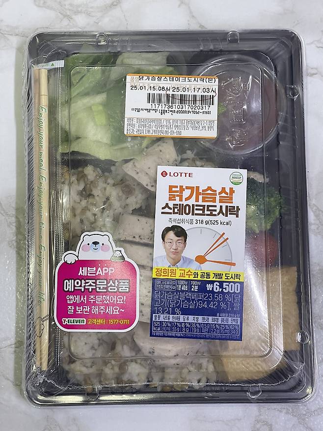 닭가슴살 스테이크도시락은 저속노화식단으로 유명한 정희원교수와 공동개발한 편의점 제품이에요.