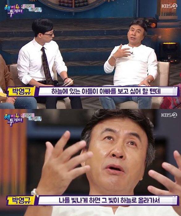 박영규는 “아들을 잃고 충격을 받아서 모든 것을 피했다. 5년 반 세상을 등지다시피 살다가 이 일을 하게 됐다”고 전했습니다. 그는 아들 사망 이후 꽤 오랜 시간 연기 활동을 멈췄고, 본인의 트레이드 마크인 코미디 연기는 더욱 멀리했습니다.