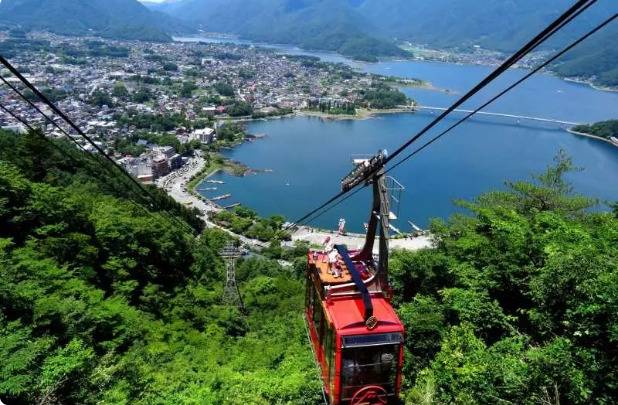 짧은 케이블카 탑승으로 정상 전망대에 오르면후지산과 가와구치코 마을 전경이 한눈에 들어옵니다.왕복 요금 약 900엔.