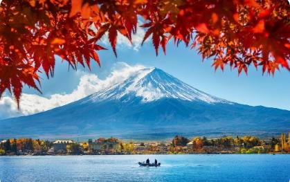 후지산과 호수가 함께 담기는 대표 뷰포인트.10월이면 단풍이 붉게 물들어, 호수에 비친 후지산이 한 폭의 그림처럼 보입니다.