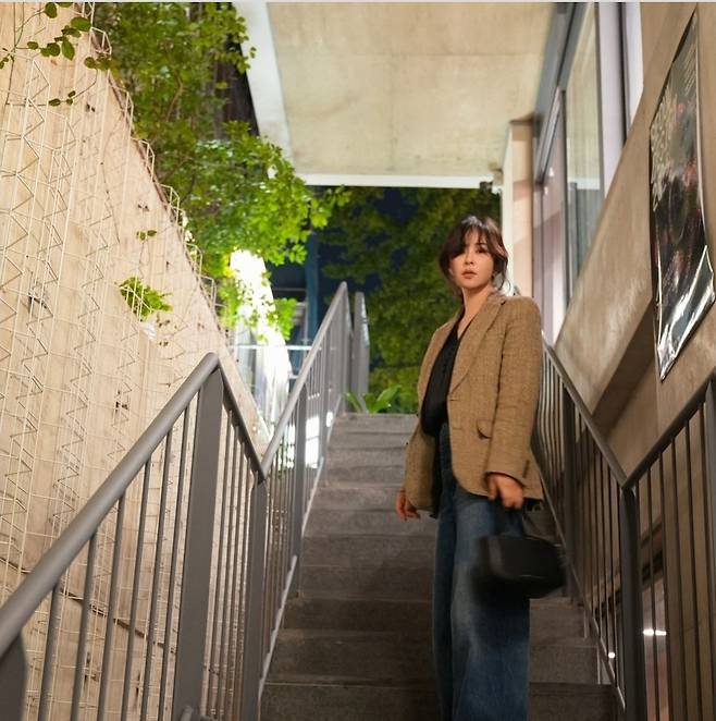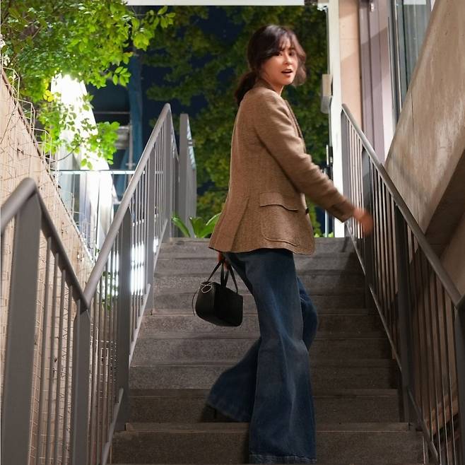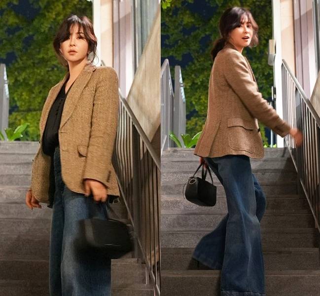 최강희는 트위드 소재의 브라운 재킷에 와이드 한 청바지를 매치해 편안하면서도 세련된 룩을 완성했습니다.