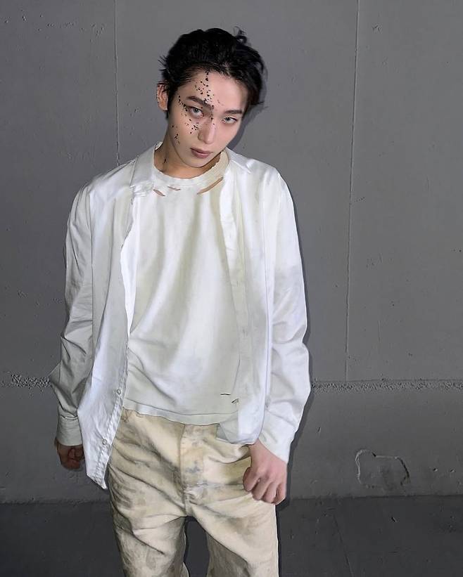 선우의 착장 핵심은 ‘화이트 셔츠+디스트로이 티셔츠’ 조합이다. 클래식한 화이트 셔츠 위로 여러 군데 자연스럽게 해어진 빈티지 티셔츠를 레이어드해, 정돈된 듯하면서도 날 것의 거친 느낌을 더했다. 여기에 웨트한 질감의 올백 헤어가 어우러지며 전체적인 스타일에 다크하고 몽환적인 무드를 더한다. 마치 패션 화보 속 한 장면 같은 비주얼이다.