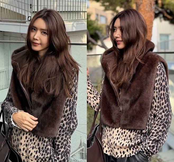 채정안은 레오파드 패턴의 톱 위에 브라운 컬러의 후드 집업 퍼 베스트를 매치해 클래식하면서도 세련된 분위기를 연출했다.