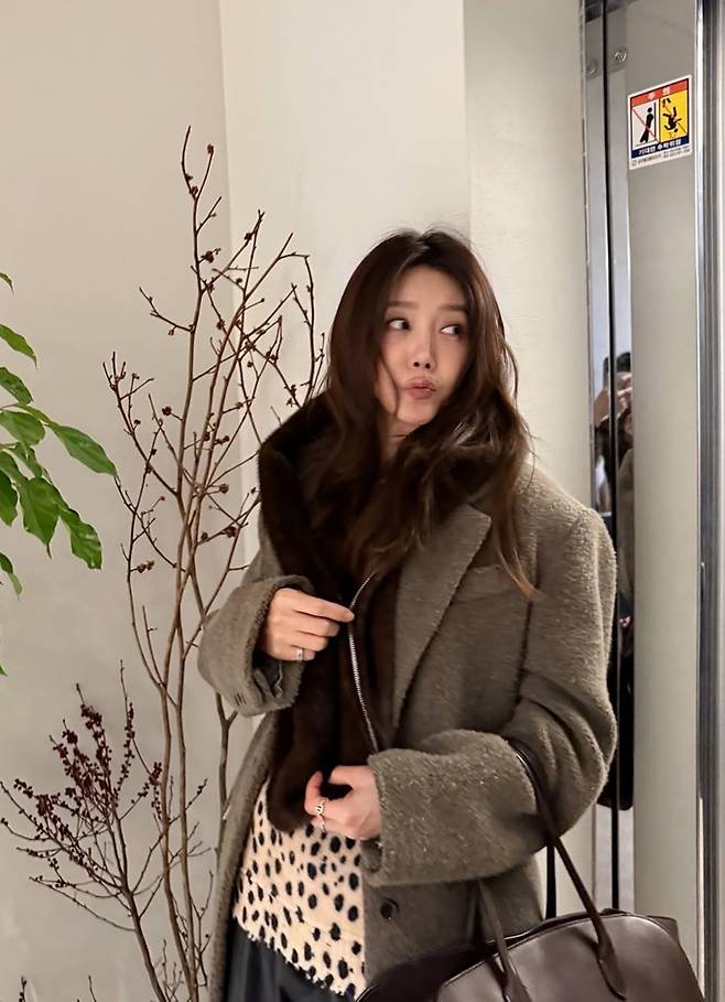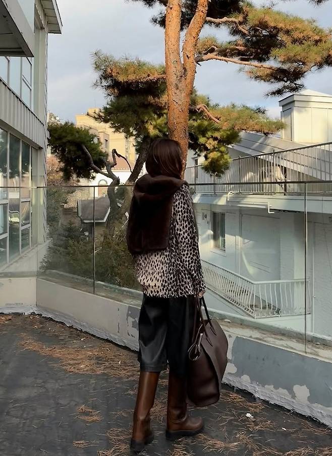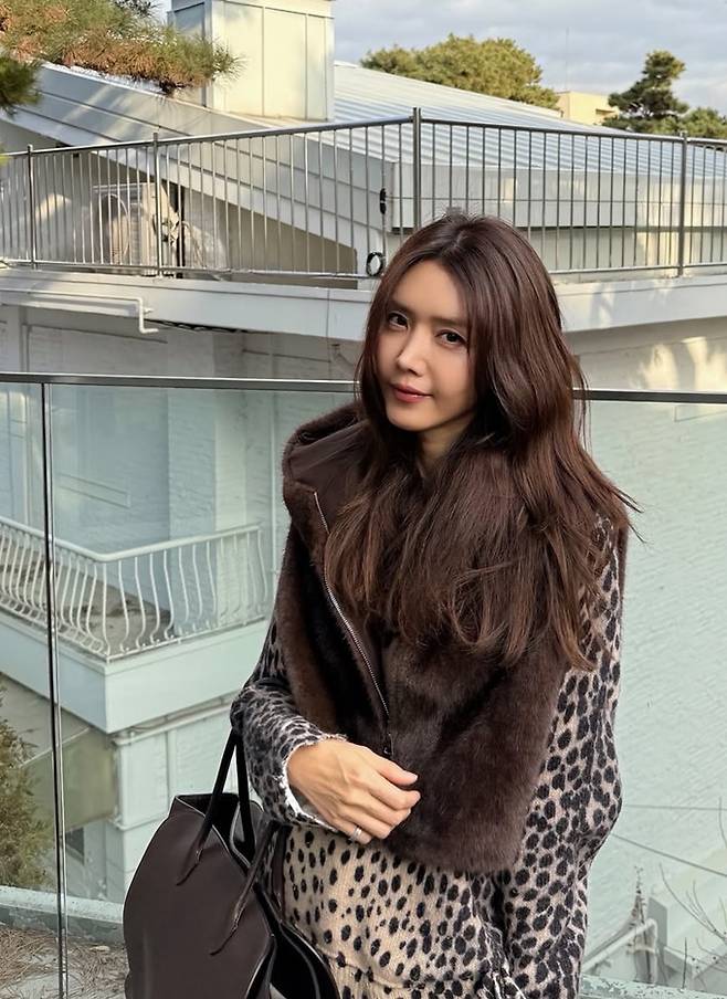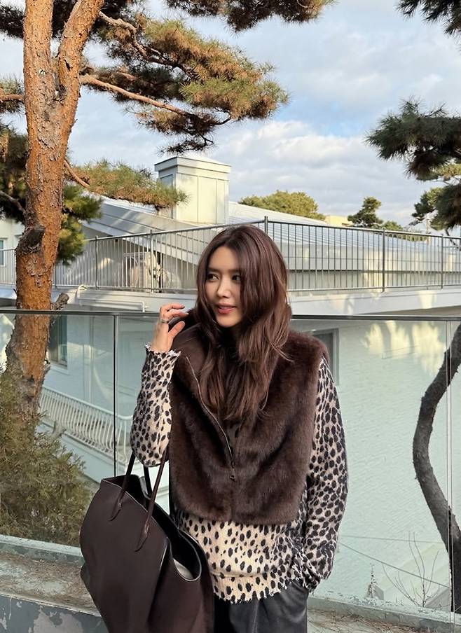 배우 채정안이 레오파드 위에 퍼 베스트를 착용한 레이어드룩으로 멋스러운 겨울 스타일을 완성했다.