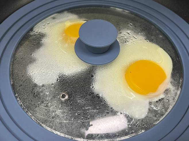 계란을 깨뜨려 넣은 후 뚜껑을 닫아 익히면 수증기를 가두어 윗면까지 골고루 익게 됩니다. 팬 내부의 열기가 순환하면서 뒤집지 않아도 노른자 윗부분에 얇은 막이 형성되며 익기 때문에, 모양이 흐트러지지 않고 깔끔한 반숙이나 완숙을 취향껏 조절할 수 있습니다.