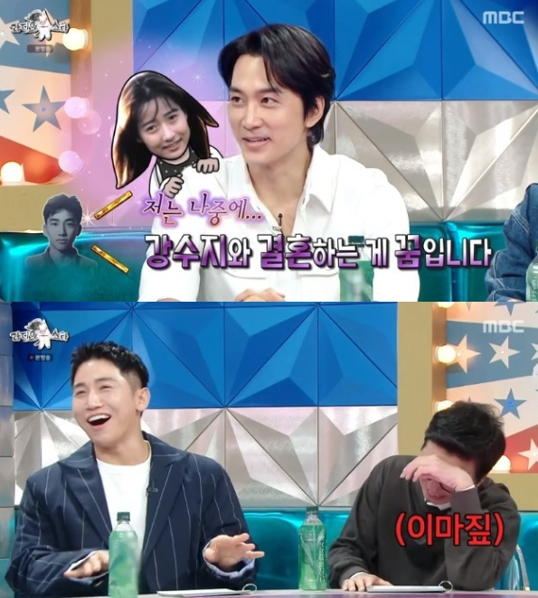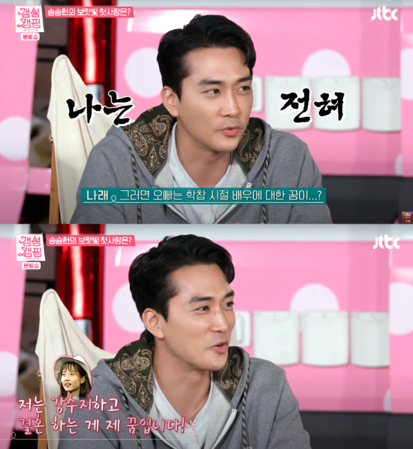 지난 5월 MBC '라디오스타'에 출연한 송승헌은 현재는 강수지의 남편이 된 MC이자 선배인 김국진 앞에서, 중학교 입학날 "강수지와 결혼하는 것이 꿈"이라고 발표한 적 있다고 전합니다.