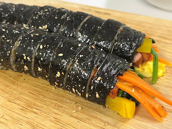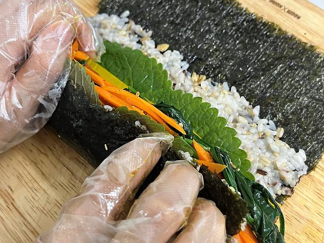 또한 김밥을 말 때는 너무 힘을 주어 꽉꽉 말지 마세요. 단순히 손가락 끝으로 가볍게 모양만 잡아준다는 느낌으로 굴려주세요. 이렇게 공기층을 살려 말아주면 시간이 지나 식더라도 밥알 사이사이에 공기층이 있어 전분의 노화 속도를 늦춰줍니다.