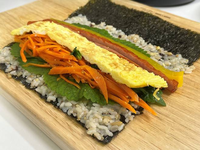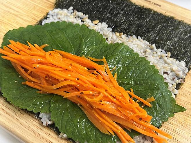 김밥 속 재료를 올릴 때 밥 위에 깻잎이나 상추 같은 잎채소를 먼저 넓게 깔아주면 수분 손실을 막을 수 있습니다. 보통은 밥 위에 단무지나 오이를 바로 올리곤 하지만, 시간이 지나면 채소의 수분이 밥알로 스며들어 밥이 눅눅해지거나 반대로 밥알이 채소의 수분을 뺏어 금방 딱딱해지기 쉽습니다.