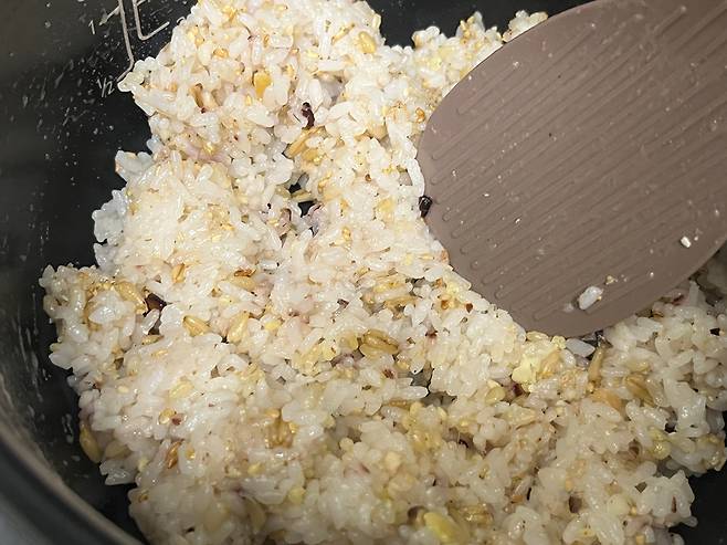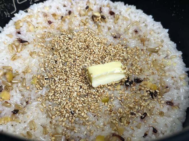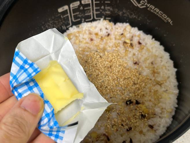 참기름은 향이 강하지만 시간이 지나면 밥알 사이로 스며들어 겉면이 마르기 쉬운 반면, 버터는 온도가 낮아져도 밥알 사이사이에 부드러운 막을 형성해 전분이 딱딱하게 굳는 노화 현상을 획기적으로 늦춰주는 역할을 합니다.