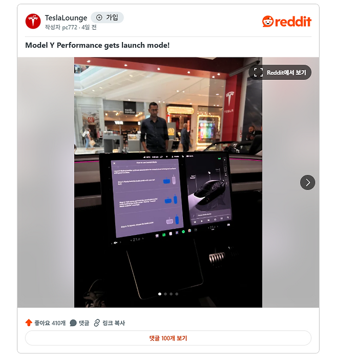 신형 모델 Y 퍼포먼스는 전·후륜에 듀얼 모터를 탑재해 네 바퀴에 동력을 전달하며, 정지 상태에서 시속 100km까지 단 3.5초 만에 도달한다. 테슬라는 공식 자료에서 런치 모드를 별도로 언급하지 않았지만, 해외 온라인 커뮤니티에 공개된 전시장 사진을 통해 해당 기능이 확인됐다.