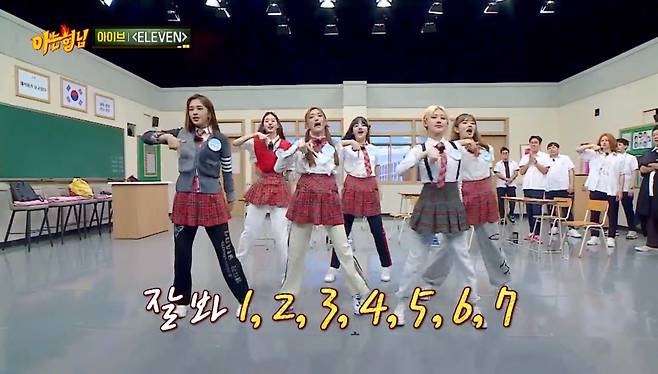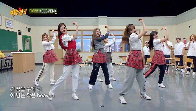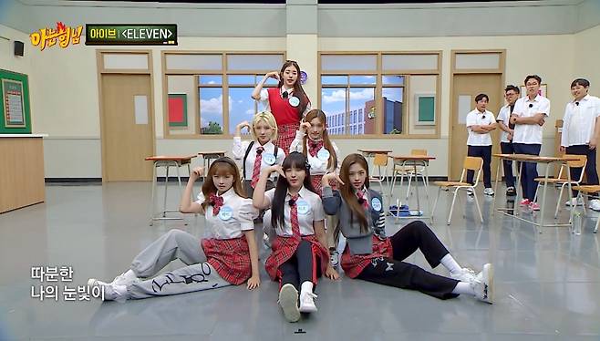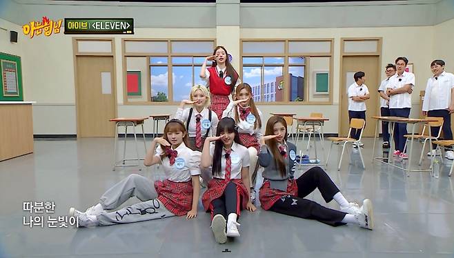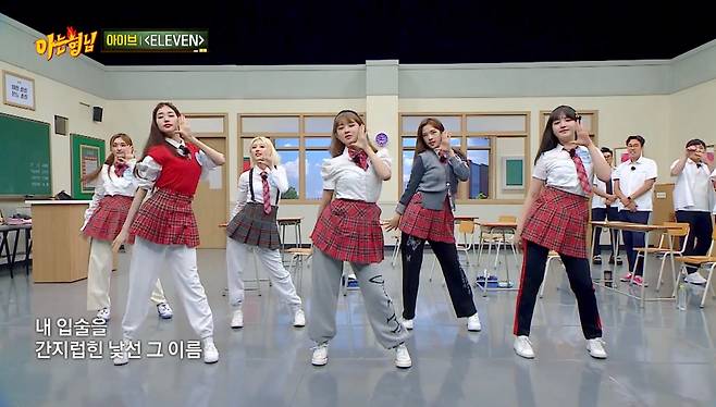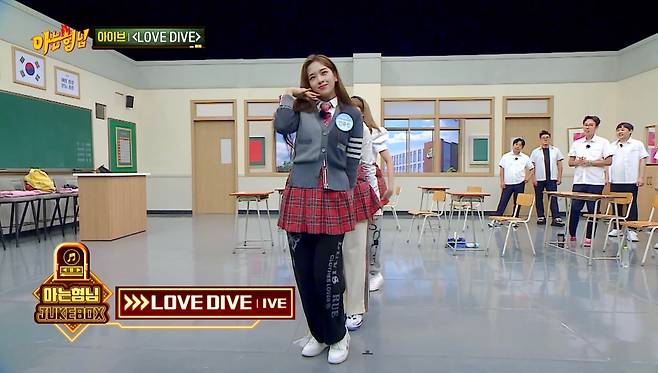 안유진은 교복패션에 트레이닝 팬츠를 착용했습니다.