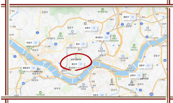 그렇게 필터링하니, 서울 각 지역에서 경매 물건이 아래와 같이 표기됐어요. 정 가운데 남산을 바라보고 있는 용산구를 찍어 봅니다.