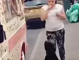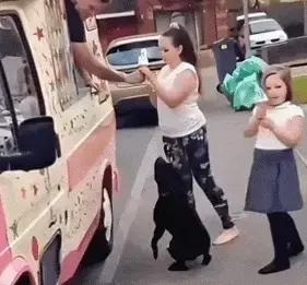 강아지는 아가씨가 먹던 것과 같은 맛의 아이스크림을 원했지만, 돈을 내야 한다는 건 모르고 있었죠.