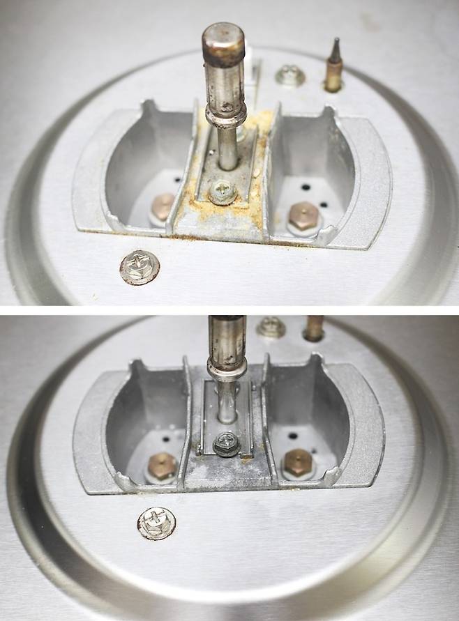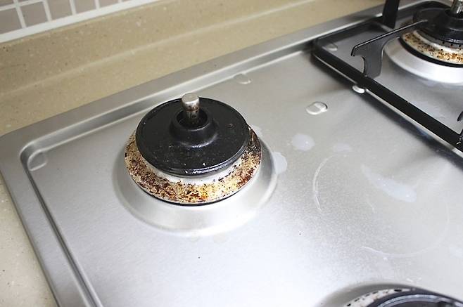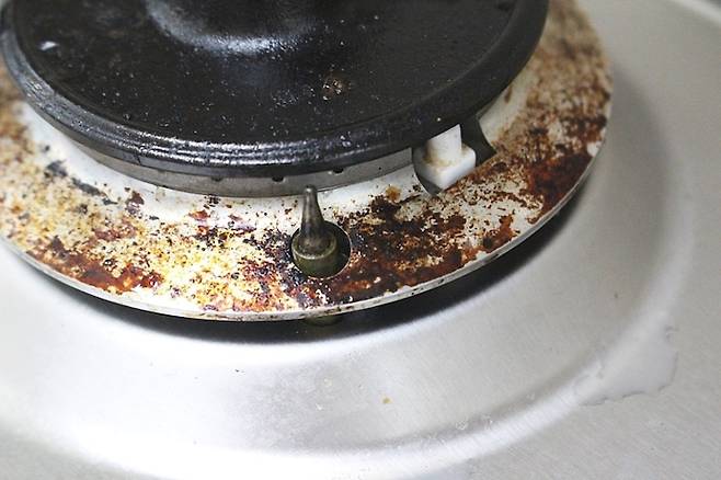 버너헤드까지 모두 분리한 가스레인지의 본체 부분 모습. 국물요리 할 때 넘치고 넘쳤던 증거들이 이렇게 모두 여기 눌러 붙어 있어요.