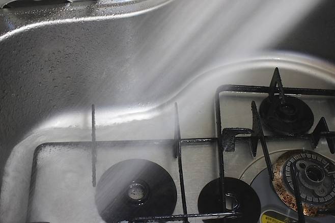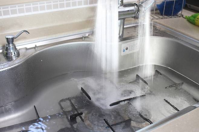 씽크대 안을 막고 뜨거운 물을 가득 부어줍니다. 분리한 그레이트, 버너캡, 버너헤드가 충분히 물에 잠길 정도로 뜨거운 물을 부어줬어요.