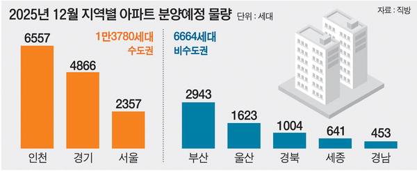 연말 전국에서 2만여 세대가 분양된다. 12월은 전통적으로 비수기지만 최근 몇 년 동안 미뤄온 분양 물량이 연말에 대거 집중되는 이례적 현상이 나타나고 있다. 올해는 상반기 대통령 선거 등 정치 일정과 정부의 대출 규제 등으로 이른바 ‘밀어내기 물량’이 늘어났다. 특히 비수도권에서는 부산이 분양 예정 물량이 가장 많아 실수요자의 관심이 쏠린다.