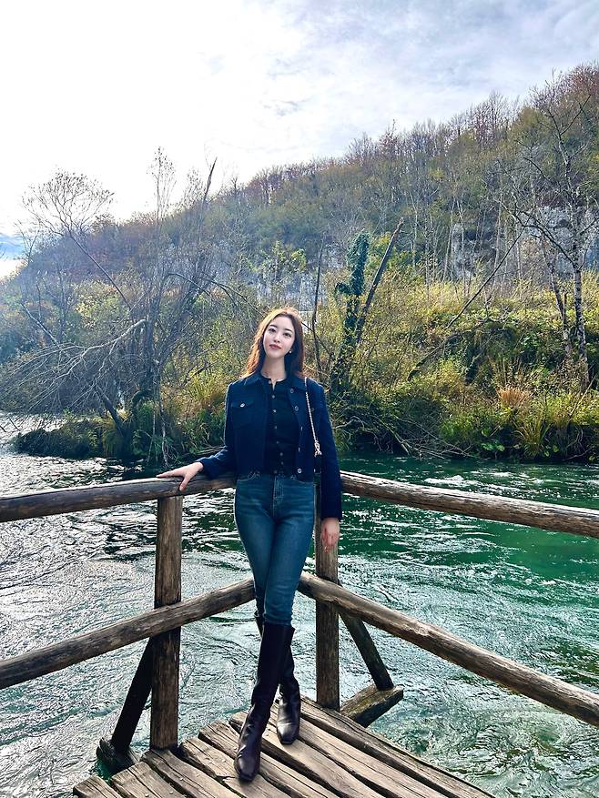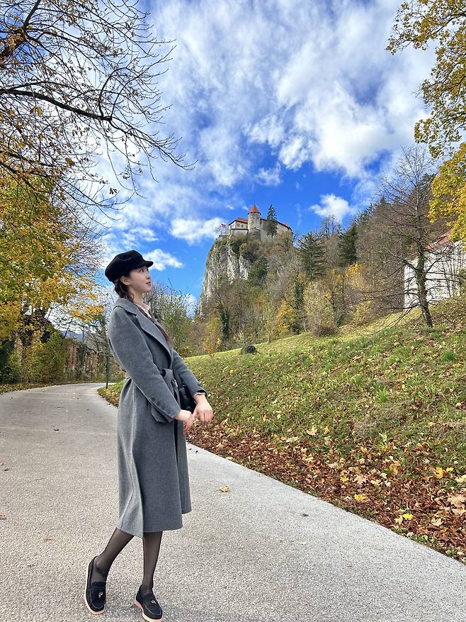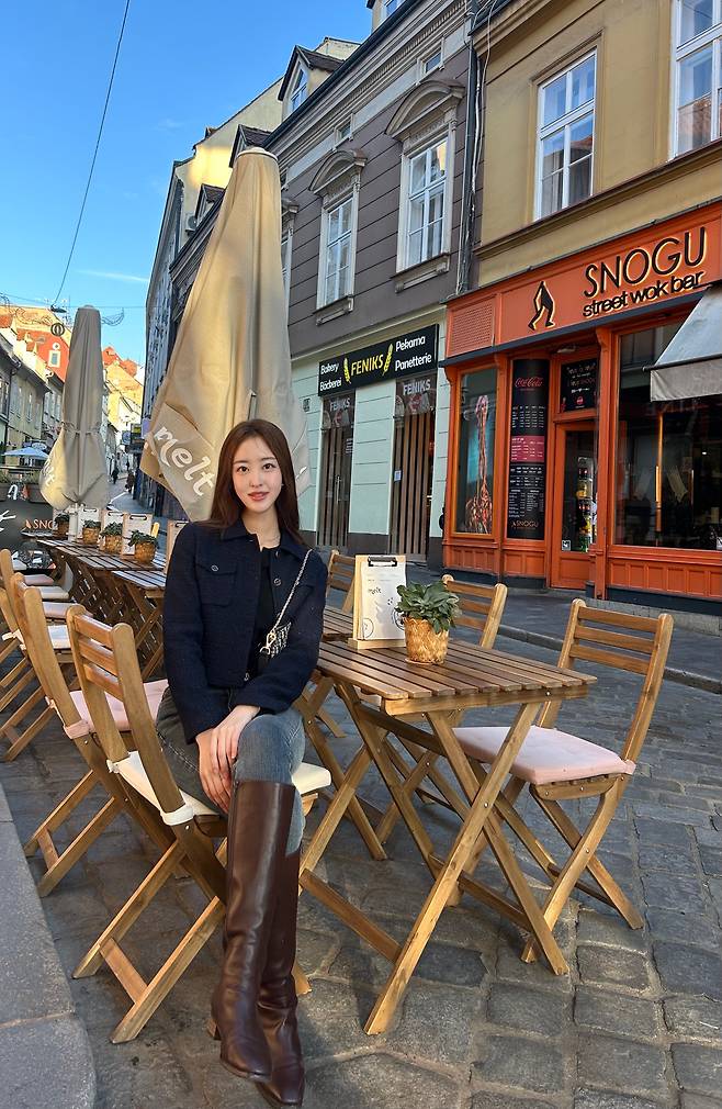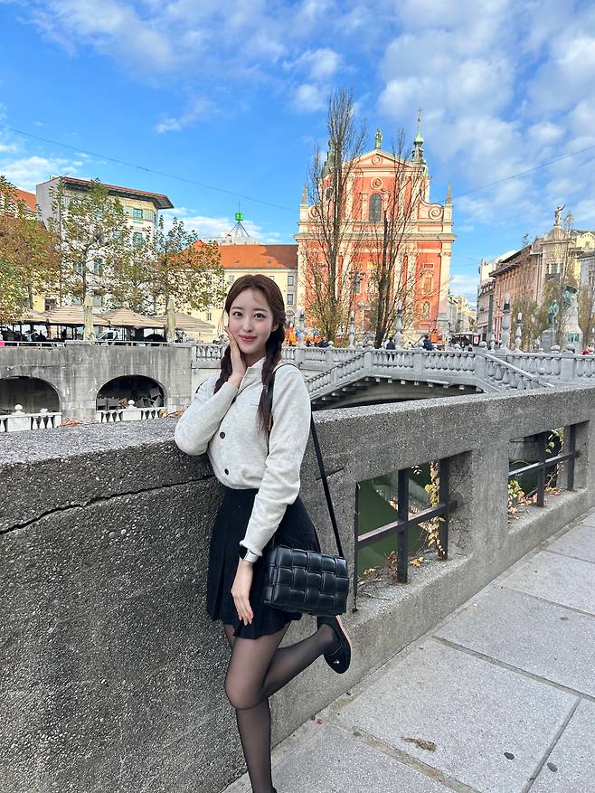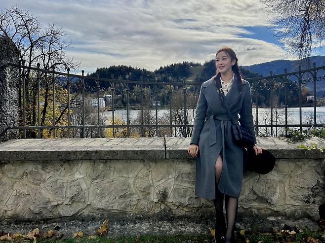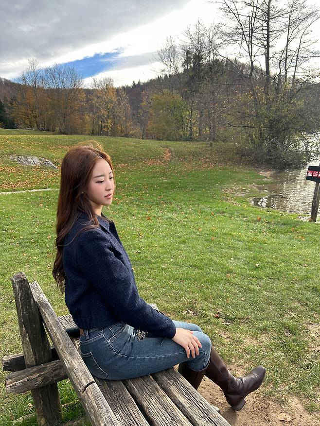 어두운 계열의 트위드 자켓이 한층 더 분위기 있고 고급스러워 보여요.