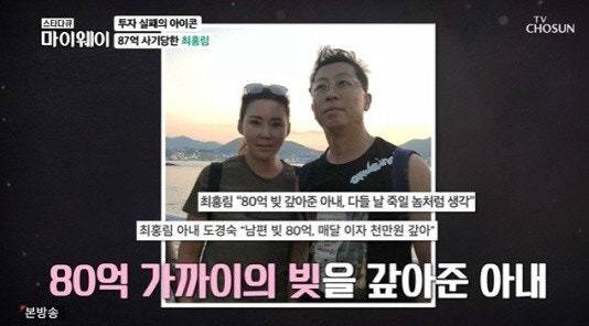 최홍림, 도경숙 부부는 SBS '자기야-백년손님'에 출연해 아내 덕에 80억 빚을 모두 갚았다고 언급했습니다. 최홍림은 "다들 80억이라는 빚을 어떻게 갚았냐고 하는데 제가 갚은 게 아니다. 아내가 갚아줬다"라고 말했습니다. 이어 "진짜 아내가 다 갚았냐면 그건 또 아니다. 처갓집이 조금 도와줬다"라고 설명했습니다.