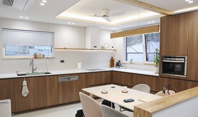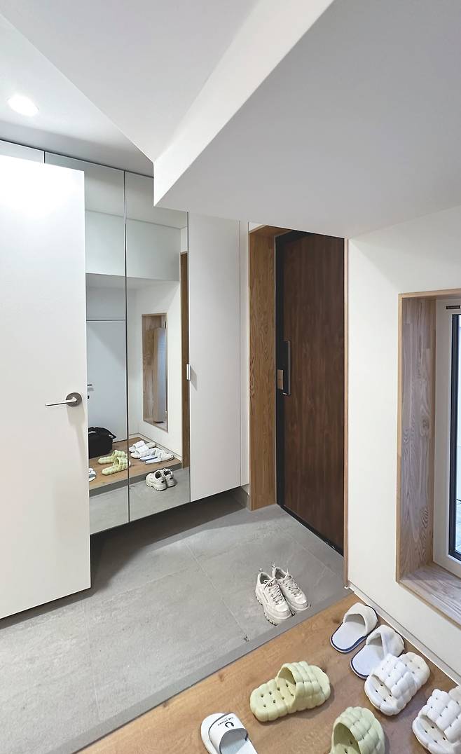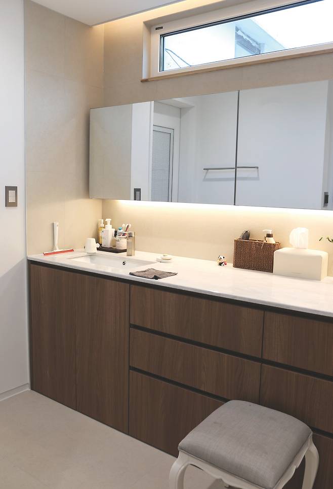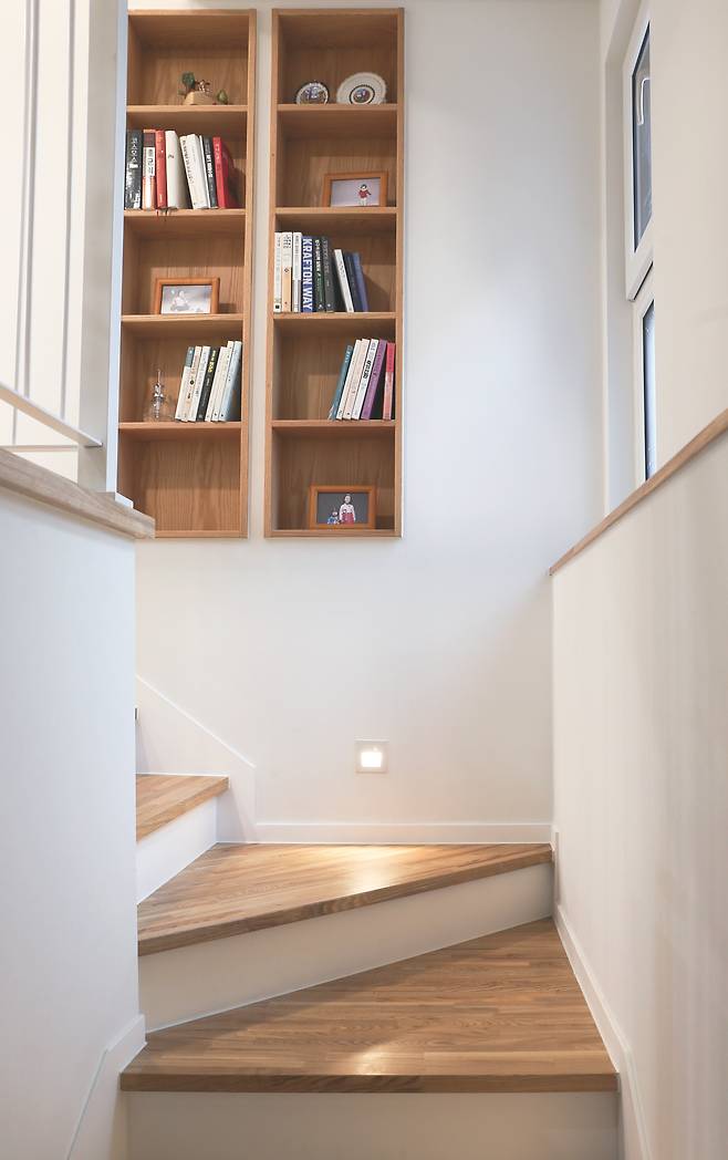 주택 컨셉은 넓지 않으면서 개방감은 확보하는 데 중점을 뒀다. 벽을 두기보다는 곳곳에 적절한 크기의 창을 내길 원했고 충분한 수납공간도 필수였다. 햇볕이 돈인 만큼 남향으로는 큰 창을 냈고 계단실에도 곳곳에 세로로 긴 창을 둬 자연광을 끌어들였다. 이 때문인지 내부는 오후 시간이었음에도 전체적으로 밝은 분위기를 띠고 있었다. 창을 충분히 냈음에도 섬세한 단열 시공 탓인지 추위는 전혀 느끼지 못했다고 한다.