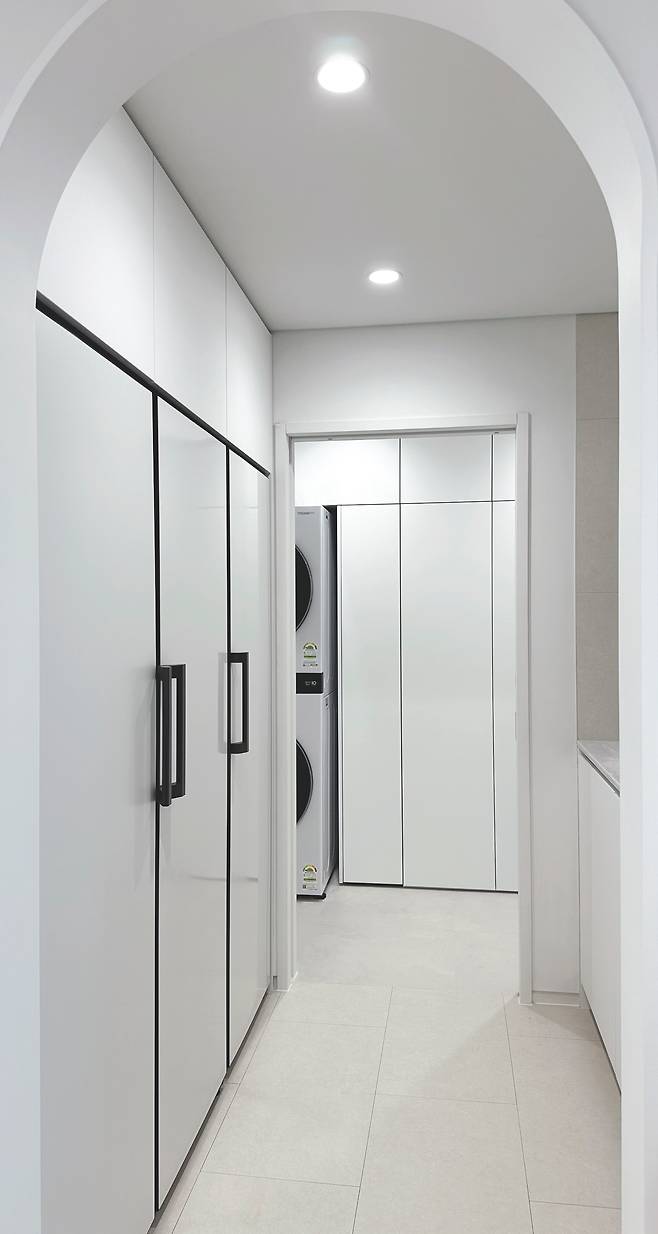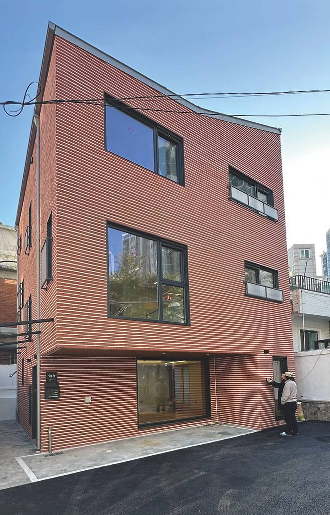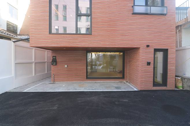 취재를 위해 찾아 주택은 마포구 구수동의 조용한 골목에 자리하고 있었다. 적색 롱브릭 파벽돌로 마감한 주택은 심심한 무채색 건물들 사이에서 조용히 존재감을 발휘하고 있었다. 주차장과 임대세대로 구성한 1층을 지나 건물 왼편으로 들어서자 주택 현관문을 만날 수 있었다. 외부와 바로 연결되면서 직접적으로 노출되지 않은 출입구는 프라이버시를 보호하는 담장 없이도 충분히 주택만의 프라이빗함을 갖추고 있었다.