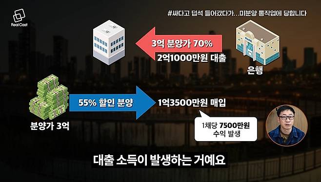 강원도에 있는 한 단지가 75% 미분양이었습니다. 이 경우 동 전체를 매입하는 이른바 ‘통작업’ 또는 ‘동작업’ 방식으로, 분양가의 45%에 매입하되 계약서에는 기존 분양가(3억 원)로 작성합니다. 법인은 대출 규제가 적기 때문에 70%까지 대출이 가능하며, 이를 통해 실제 금액보다 훨씬 높은 대출을 받게 됩니다.