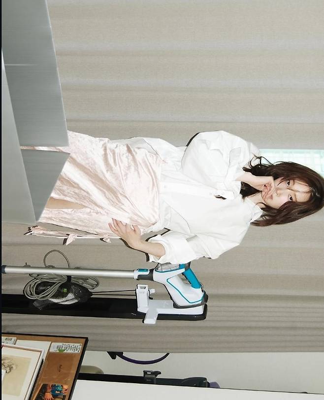 전종서는 화이트 오버핏 셔츠에 연한 베이지 컬러의 벨벳 슬릿 스커트를 매치하고 자유롭게 포즈를 취해 내추럴한 고급미를 뽐냈습니다.