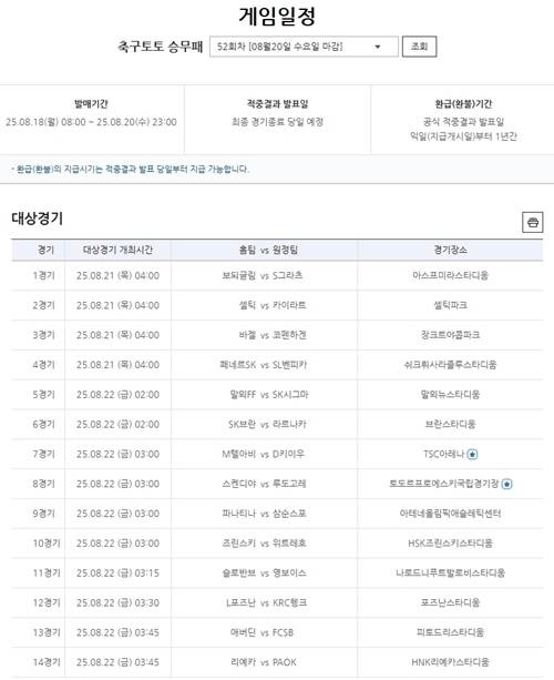 축구토토 승무패 52회차는 유럽축구연맹(UEFA) 챔피언스리그(UCL) 및 유로파리그(UEL) 플레이오프 경기들이 선정됐다. 보드글림트-그라츠(1경기), 바젤-코펜하겐(3경기), 페네르바체-SL벤피카(4경기), 파나티나이코스-삼순스포르(9경기), 리예카-PAOK(14경기) 등 팬들의 관심을 모을 유럽 축구 경기들이 포함됐다.
