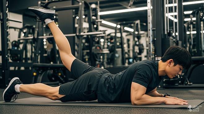 엎드린 상태에서 한쪽 다리를 뒤로 들어 올렸다가 내린다. 허리를 과하게 꺾지 말고 엉덩이에 힘을 준다.