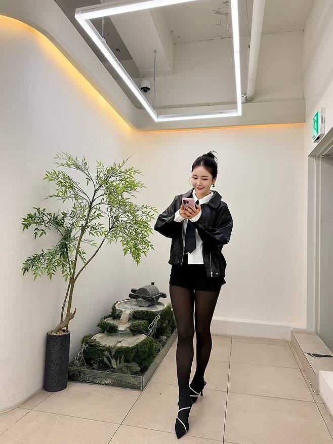 하의는 미니 쇼츠에 블랙 시스루 타이츠를 매치해 다리 실루엣이 길고 슬림하게 강조되었고, 포인트가 되는 스트랩 힐은 발끝 라인을 예쁘게 잡아줘서 전체 비율이 훨씬 조화롭게 보였어요.