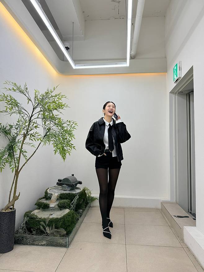헤어는 단정하게 묶은 업스타일이라 얼굴의 또렷한 선이 더 강조되었고, 밝게 웃는 표정과 블랙 톤 스타일링이 묘하게 잘 어울렸어요.