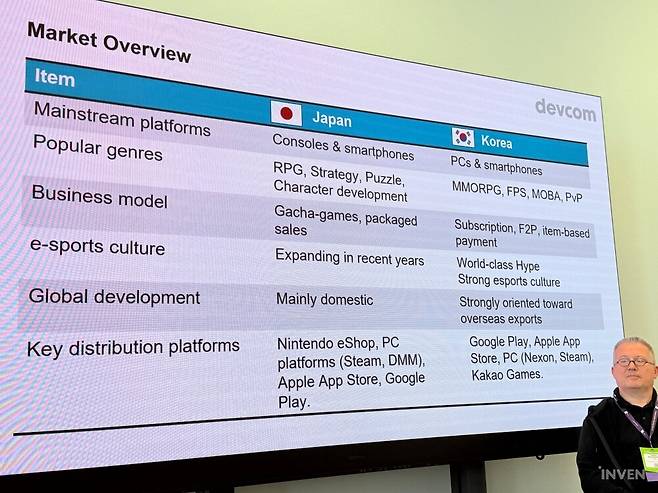일본 게임 시장의 특징을 다음과 같이 설명했다. "일본에서는 게임 시장이 콘솔과 스마트폰을 중심으로 돌아간다. RPG, 전략, 포토 게임이 인기 장르다. 가챠라는 일종의 랜덤 보상과 패키지 판매 모델이 주류를 이룬다. 수출이 증가하고 있지만 여전히 대부분 내수 중심이며, 데토 샵, 스팀, 모바일 앱스토어가 주요 플랫폼이다."