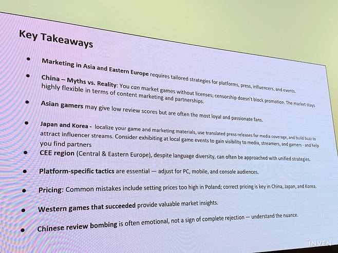 이날 그는 '판호'에 대한 중요한 오해를 바로잡았다. "많은 개발자들이 '판호가 없어서 이 나라에 진출할 수 없다'고 생각하는 것은 매우 일반적인 오해다. 실제로는 그렇지 않다. 물론 판호가 있으면 도움이 되고, 특히 모바일 게임의 경우 그렇다. 하지만 게임이 스팀이나 플레이스테이션 스토어에 있다면 이미 이 시장에 진출한 것이나 다름없다."