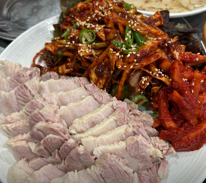 ▶ 오징어보쌈부드러운 수육과 탱글한 오징어가 함께 나와쌈장, 새우젓과 조합이 훌륭합니다.칼국수만 먹기 아쉬우면 필수 주문!