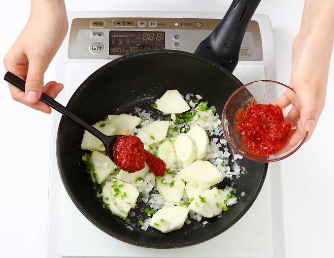 5. 달군 냄비에 기름을 두르고 다진 마늘, 양파와 청양고추를 넣고 볶은 후 사과를 넣고 ④의 소스를 넣어 볶는다.