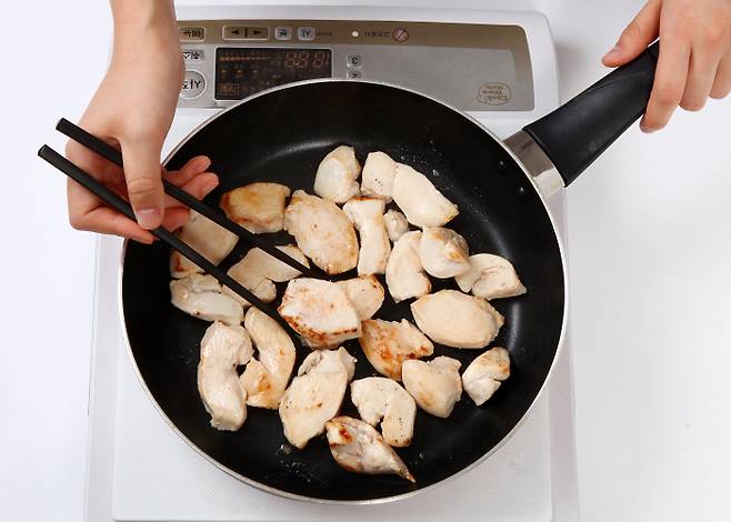 3. 달군 팬에 기름을 두르고, 닭고기를 노릇하게 굽는다.