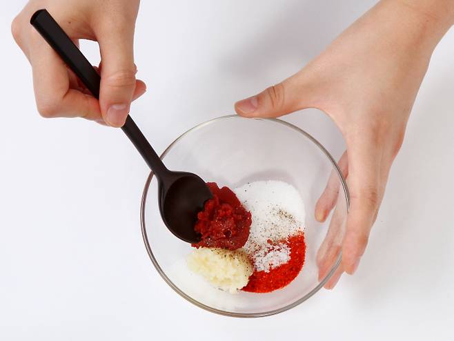 4. 볼에 고추장, 다진 마늘, 설탕, 물, 고춧가루, 소금과 후추를 넣고 소스를 만든다.