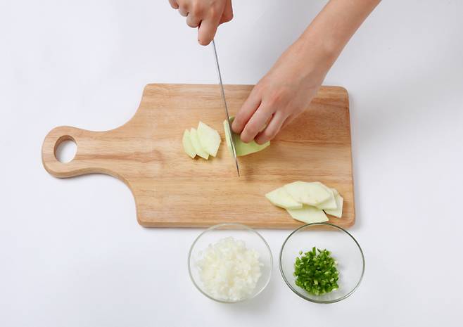 2. 사과는 껍질을 제거 한 뒤 씨를 제거하고 4등분으로 잘라 0.5㎝ 두께로 슬라이스하고, 양파와 청양고추는 잘게 다진다.