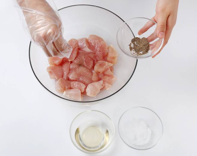 1. 닭고기는 먹기 좋은 크기로 자른 후 소금, 후춧가루와 청주를 뿌려 간을 한다.
