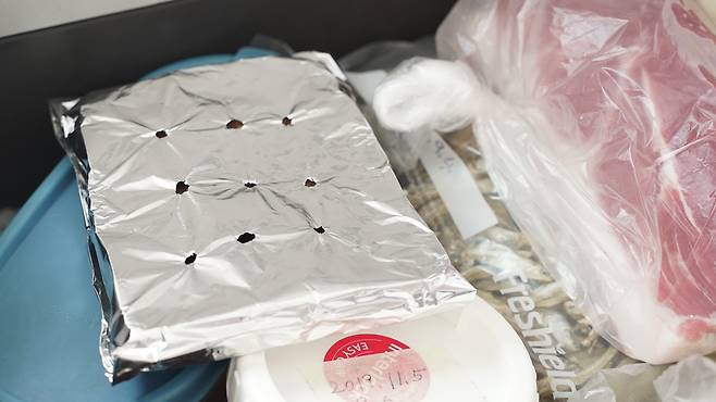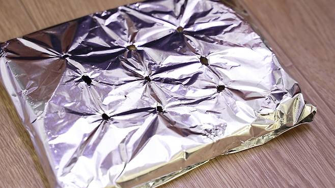새까맣게 태운 빵을 포일에 넣고 숨구멍을 여러 군데 뚫어 줍니다. 그냥 넣어도 되지만 이렇게 두면보다 깔끔하게 보관이 가능해요.